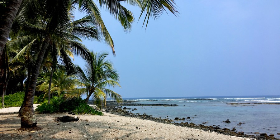 We spent our first day exploring the beautiful beaches around Kona. We set out in the morning to Kealakekua Bay, but upon arrival realized this might not be the best spot for swimming and relaxing since there was no open shore and tons of rocks. We noticed a sandy area down the shoreline, so we headed back that way. (Basically if you’re taking directions to Kealakekua Bay, turn left at the end of the road, instead of right.) What we found, hidden behind a small village, was a completely deserted beach with crystal clear water. I’m still unsure if it’s deserted all the time or because the erupting volcano scared away everyone. Either way, it was a perfect spot to spend our morning.