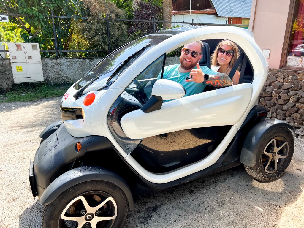 We woke up to lots of rain during our third day, — which meant we’d be coming home drenched each time we made the trek to the end of the dock — but we tried to make the best of it anyway! We set out in our little rental for the day, a two seater electric car, and we were able to drive the whole perimeter of the island in about an hour. Because of the rain, we didn’t make many stops along the way, but the views of the water and mountain were gorgeous the whole drive. (Tip: Once you pass “town,” there isn’t much more on the drive besides one or two turnouts that are marked on the map provided by the rental company.)