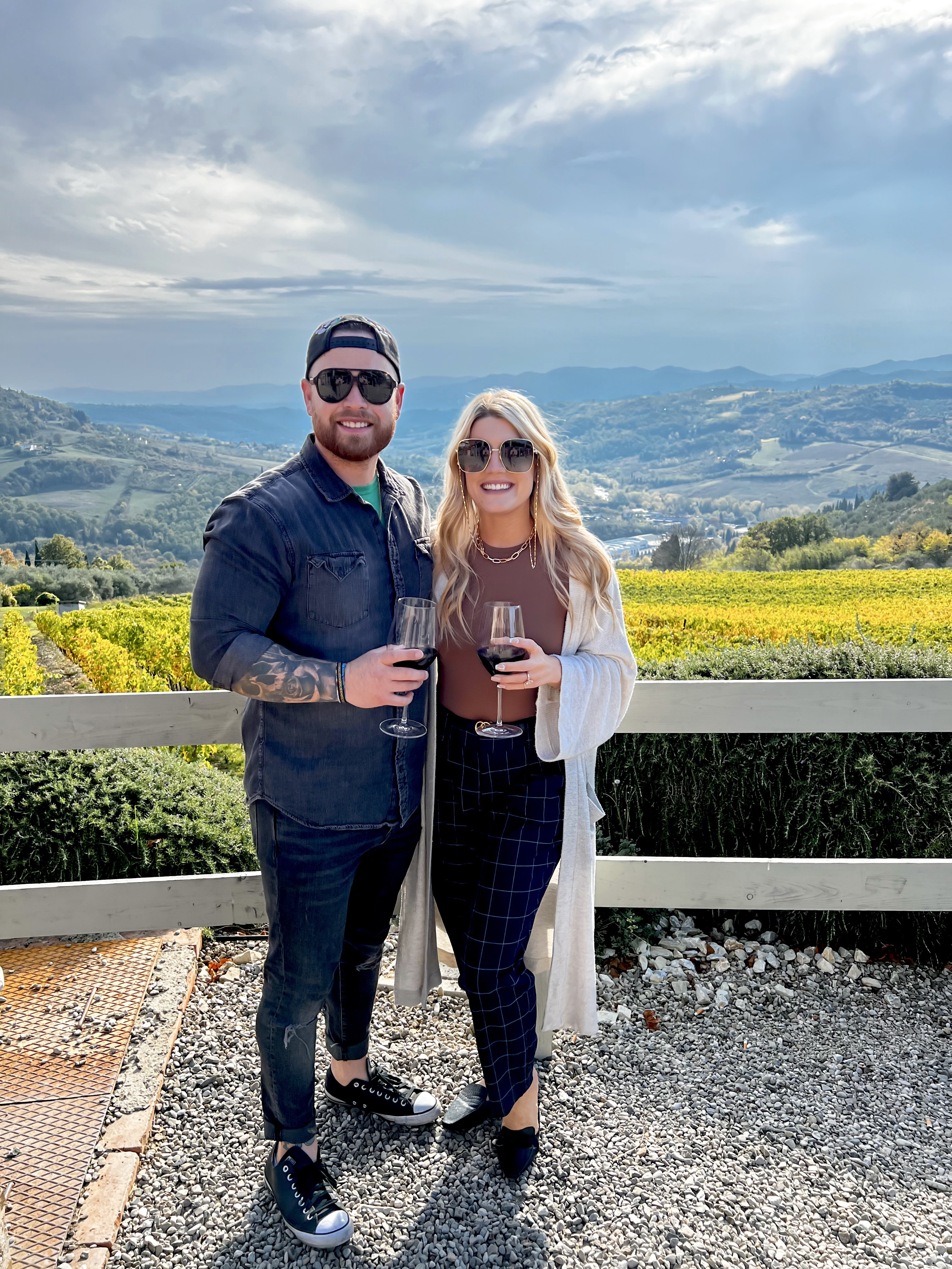 A bit further down the road, you’ll find Il Quartino winery — recommended by our CA at Gucci. Be sure to make a reservation ahead of time, as they were completely booked when we arrived. The winery has the most gorgeous views of the picturesque green rolling hills you would dream of seeing in Tuscany. Luckily, since it was our honeymoon, Joe was able to convince the host to let us enjoy a glass of wine on the empty bench set aside for smokers, which was the perfect relaxing afternoon we needed — until said smokers showed up.