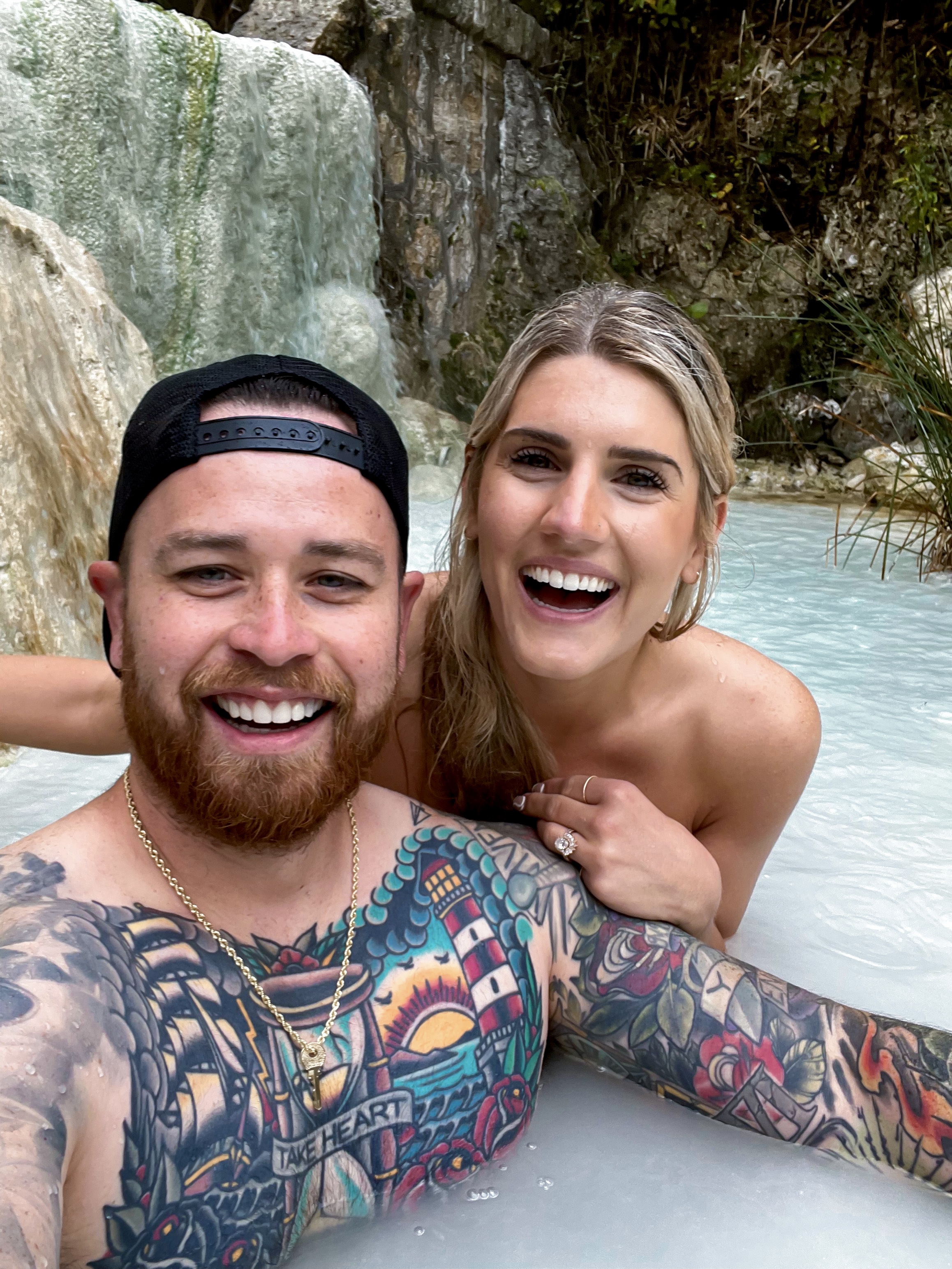 It started raining as soon as we arrived, and even though I was wearing all white outfit, we continued on the muddy hike to the water. The first open pool of water was being enjoyed by a small group of people, but if you continue down the path, you will find many open sections to enjoy privately. Since we didn’t have swimsuits, we found an alcove that we were able to enjoy in our underwear while the rain drizzled down. It ended up being one of our favorite moments of our honeymoon.