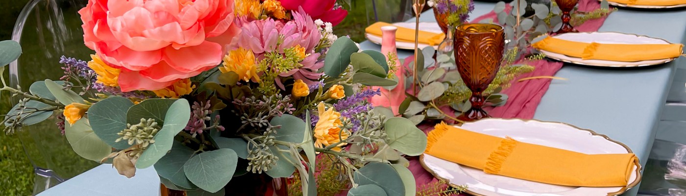 Since I did use a majority of fake florals, to bring some life in to the tablescape, we picked up some fresh eucalyptus and other greenery to line the table. I love doing this combination because it allows me to make the arrangements of head of time and focus on other areas the day of a party, but still having that freshness mixed in.