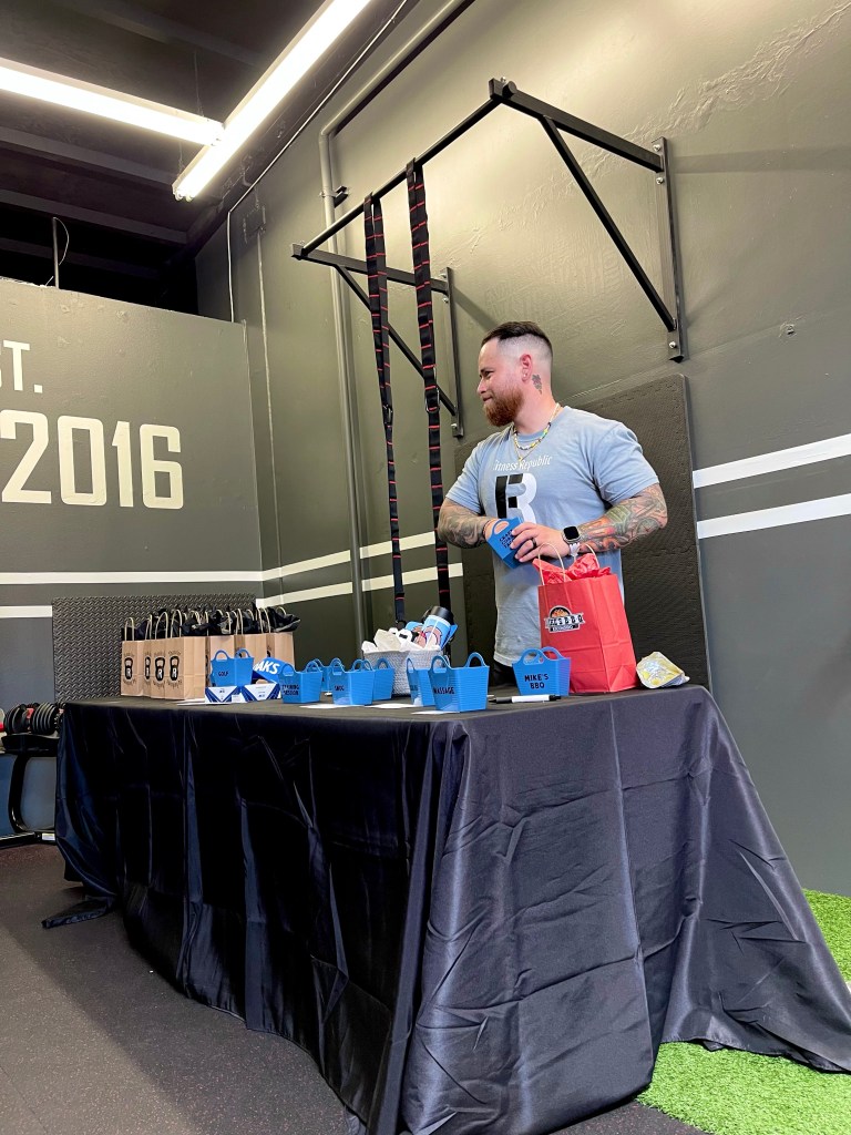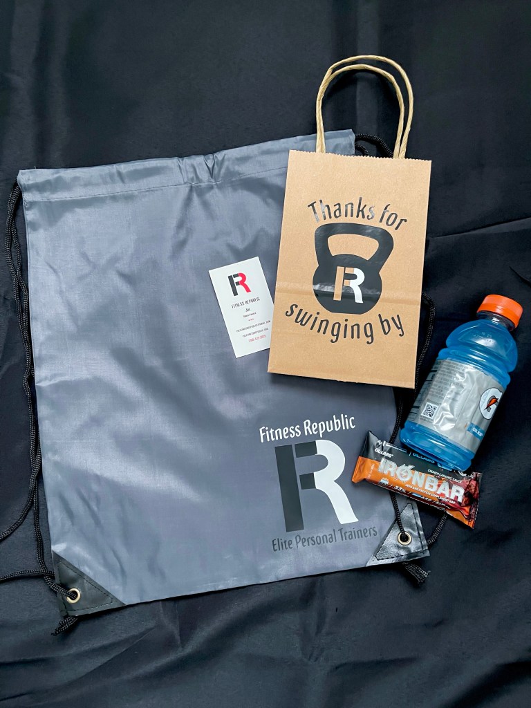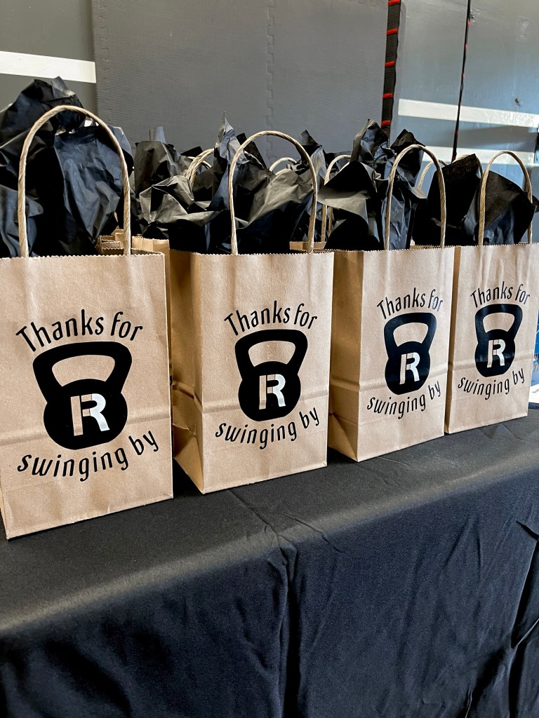 I also wanted gift bags for everyone to be able to take home, that we could include a business card inside, along with some merch and a few fitness related snacks.