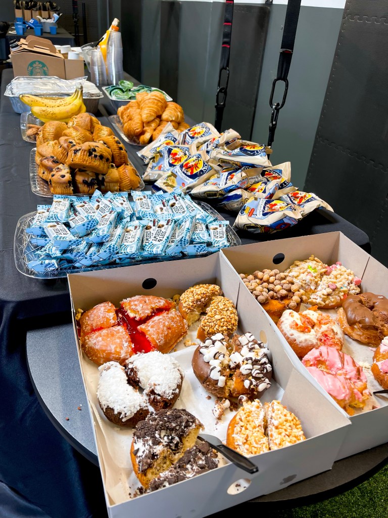 Inside, we filled the space with different vendors, including a physical therapist, massage therapist, and even Nektar set up a booth with free samples. We had tables with lots of grab-and-go breakfast and a few boxes of coffee from Starbucks.
