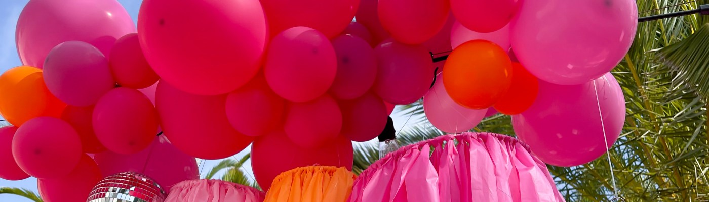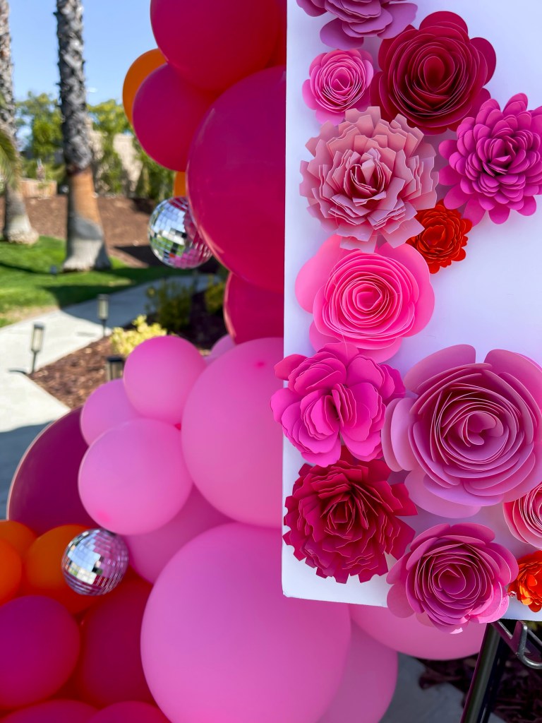 The backdrops were ones I’ve had and used previously, and I really wanted a huge statement, so I used all 3, matching the paint to different pink and orange elements I was using elsewhere for the party. For the balloon arch, I used 4 different packs, so I could mix and have enough big sized balloons between this arch and the one I was placing out front for the welcome sign.