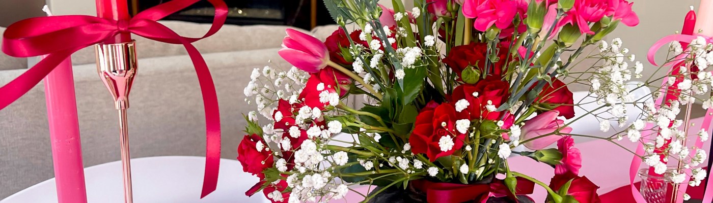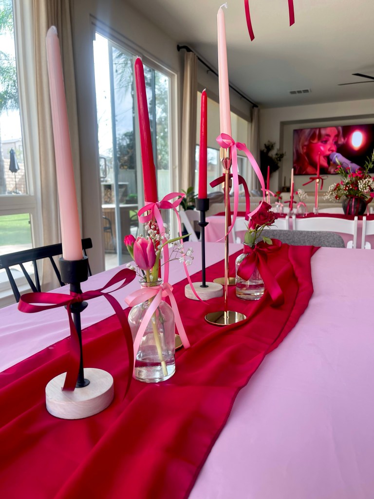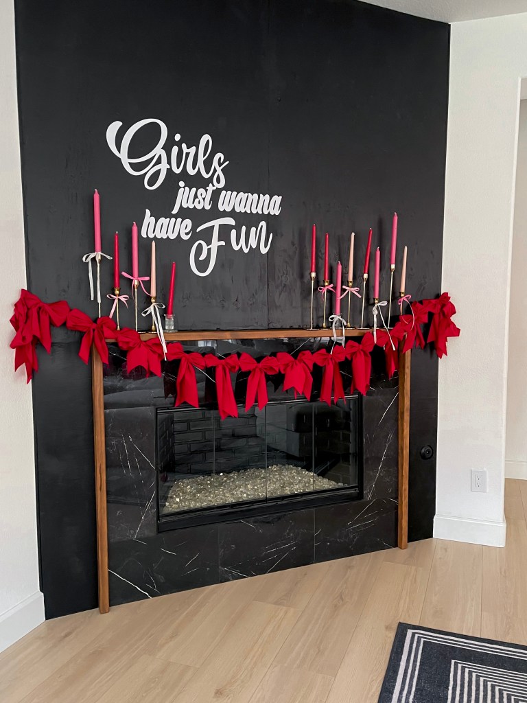 Using all my same red and pink candlesticks from past events, and favorite holders, I filled the mantle mixing and matching combos, and paired them with the adorable bow garland I DIYed for Christmas.