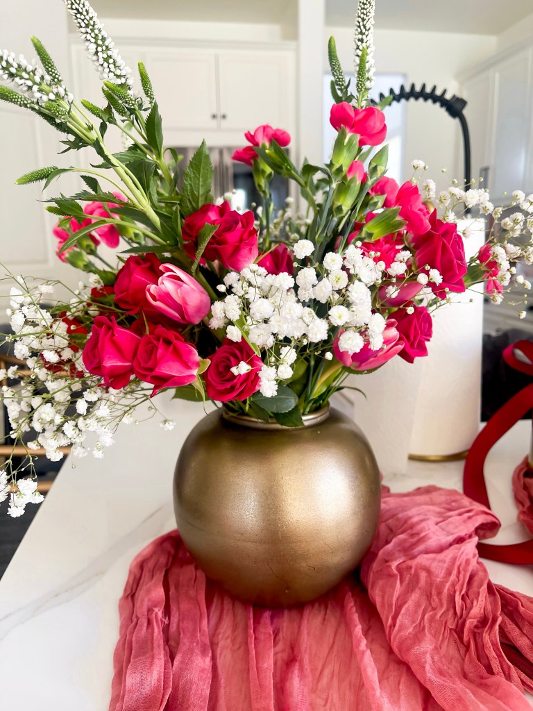 For the longer table, using flowers from Trader Joe’s, I arranged a centerpiece inside the vase I normally display on our dining table. The key is to get different lengths of stems to add height and visual interest and then some greenery for filler. I started with my base using the flowers to fill the pot, then filled in with my higher greenery stems for dimension and baby’s breath around the bottom for balance and shape.