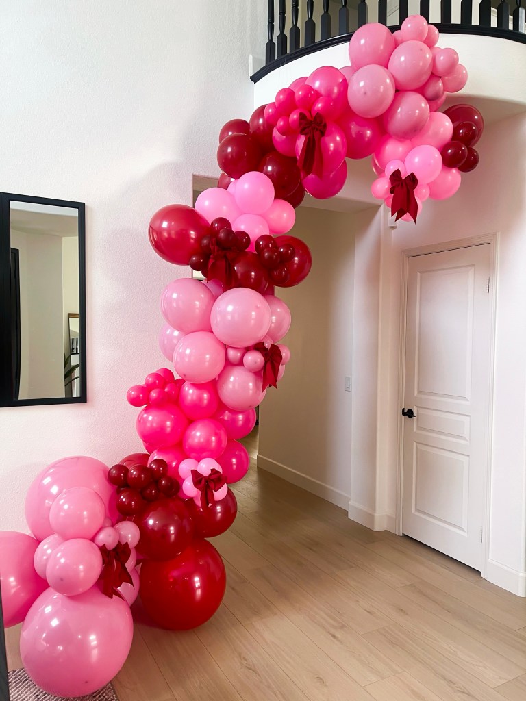 Inside the front door when guests walked in, I built a large balloon garland, again mixing different pinks and reds. To secure, I used stretchy jewelry elastic to tie the top portions to the stair railings and a bag of rocks attached to weigh down the lowest cluster of balloons.