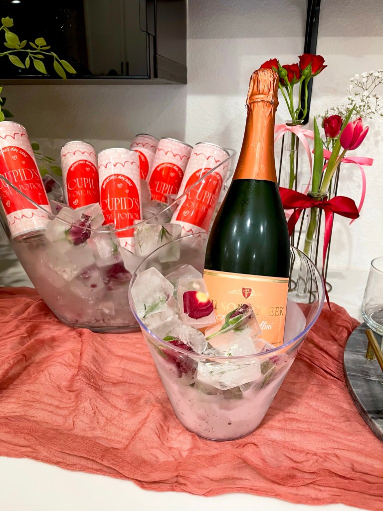 Flower ice cubes is the easiest, but most timing consuming detail, and since it always adds such a fun pop of color to any drink display, I’ll continue to torture myself with the time I spend on it. I usually will grab 3-4 different small flower bunches to use and snip off all the blossoms into a bag. (Tip: I’ll store them in the fridge to keep fresh during the lengthy process.)