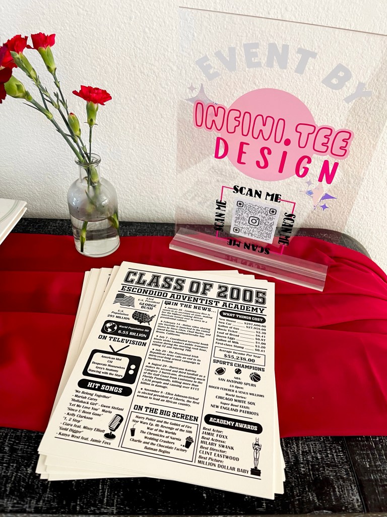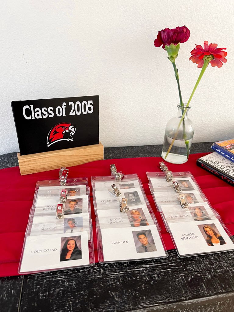 I wanted to add some custom elements throughout the party too, so using my Cricut, I cut out a giant vinyl sticker of the school mascot for the cornhole boards, ordered some 2005 newspapers off Etsy, and made everyone a name tag that had their senior picture on it.
