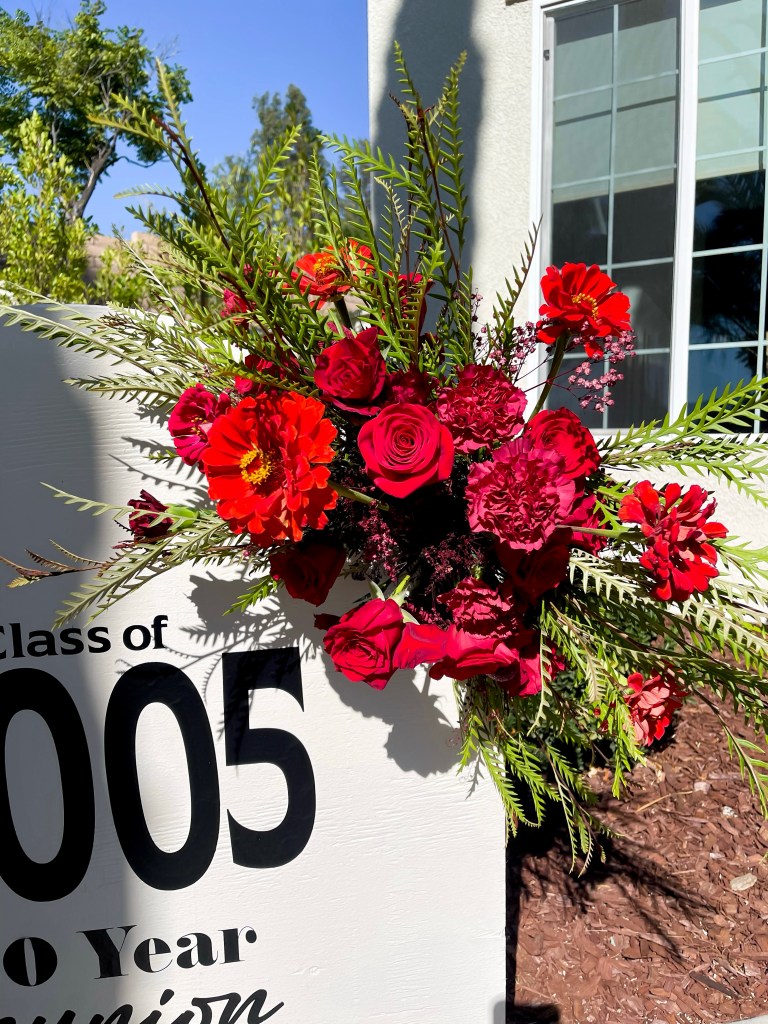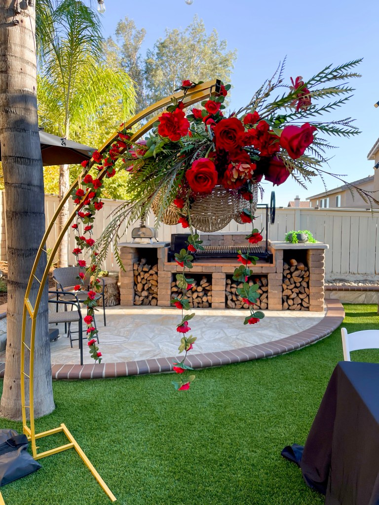 Now this is where my second mistake happened. To attach the flowers to the pendant and also the welcome sign out front, I got a bunch of floral foam from Dollar Tree that I clipped and zip tied on. Well, like an idiot, I didn’t realize there was a difference between flower foam and synthetic flower foam. The biggest difference being that on one of the hottest days of the summer, my flower foam wasn’t going to absorb and hold any water for my flowers that so desperately needed it. *Cue to me 30 minutes before the party barely pulling the flower stems out of water to assemble.*
