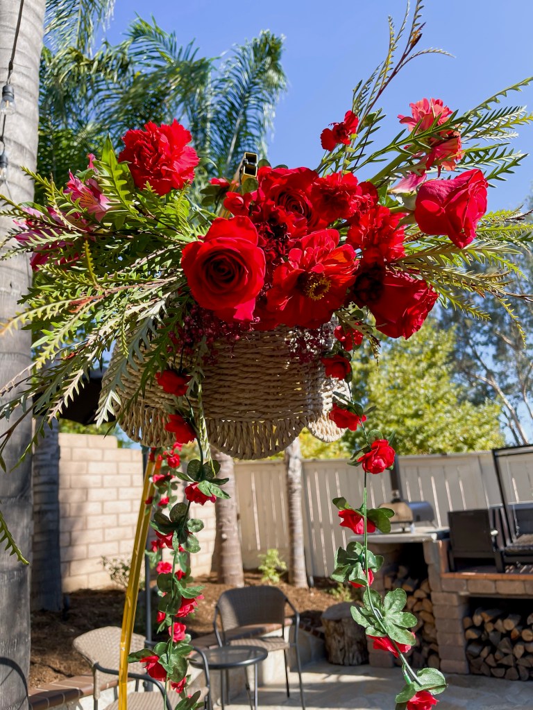 After scouring Pinterest for hours, through all the very romantic black with red roses parties, I finally found a tiny bit of inspiration in using lots of red summer florals and natural wicker and rattan elements.
