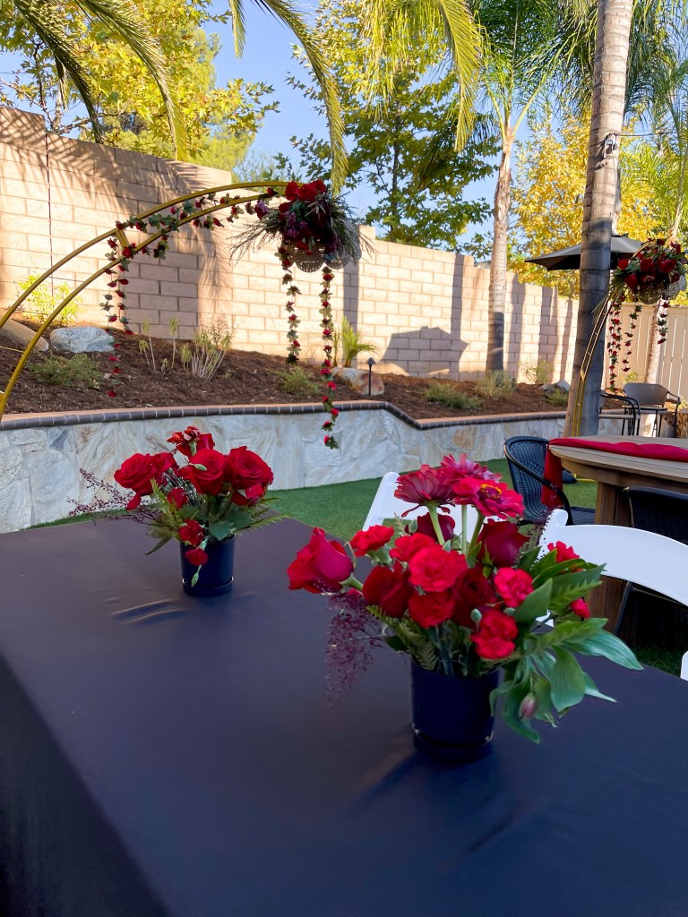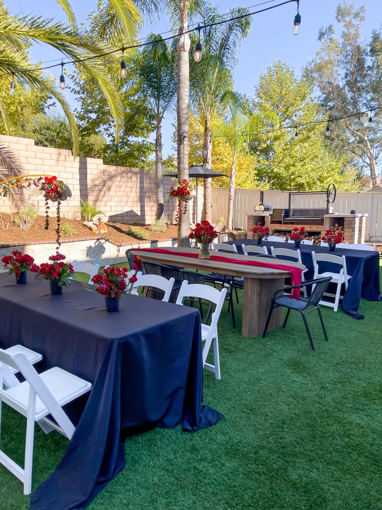 I planned to keep the table settings simple, since we weren’t having any sort of formal sit down meal, and I figured most people would be standing mingling. Black tablecloths, red runners, and a few small flower arrangements — which ended up being my first mistake of the night.