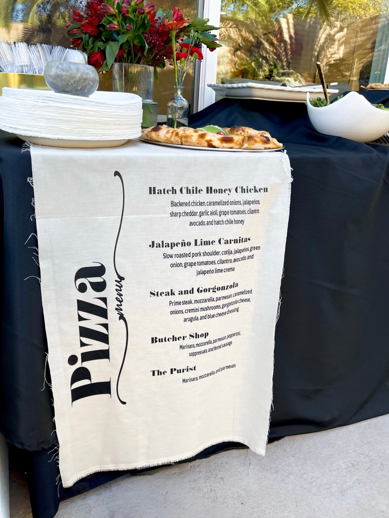 Using some linen fabric and HTV vinyl, I created a custom pizza menu to drape across the buffet. This is such an easy addition to any food or bar space that won’t take away from any valuable table top you might need.